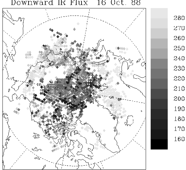 Downwelling longwave fluxes over the Arctic were computed using temperature and humidity profiles and cloud information derived from the TIROS Operational Vertical Sounder (TOVS) radiances. (Courtesy of J. Francis)