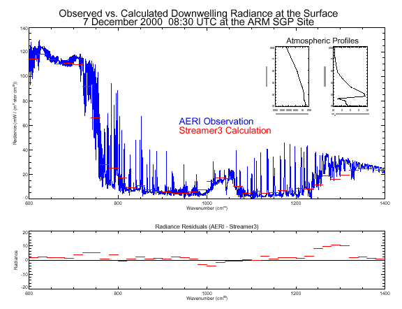 Comparison of downwelling longwave radiance at the surface as measured by the AERI instrument with that calculated by Streamer. Observations were taken at the ARM SGP site in northern Oklahoma. (Courtesy of D. Turner)